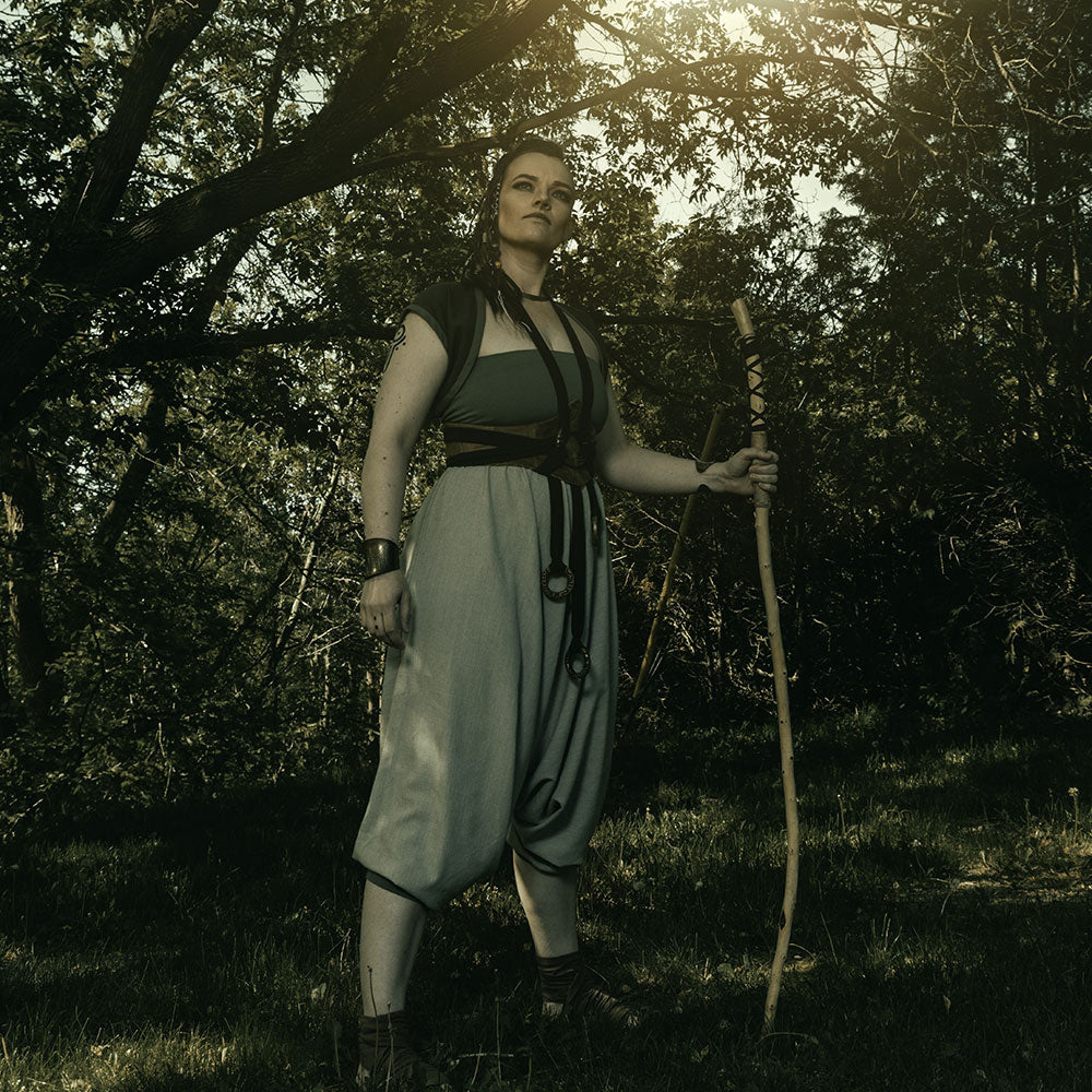 Ce sarouel à fourche très basse offre un look ample et fluide, parfait pour tes costumes de GN (jeu de rôle grandeur nature) ou ton cosplay inspiré de Aladdin. En version remontée, il se transforme facilement en combinaison bustier (simplement en remontant le pantalon), pour une silhouette différente qui peut rappeler le style de Marle dans Chrono Trigger.